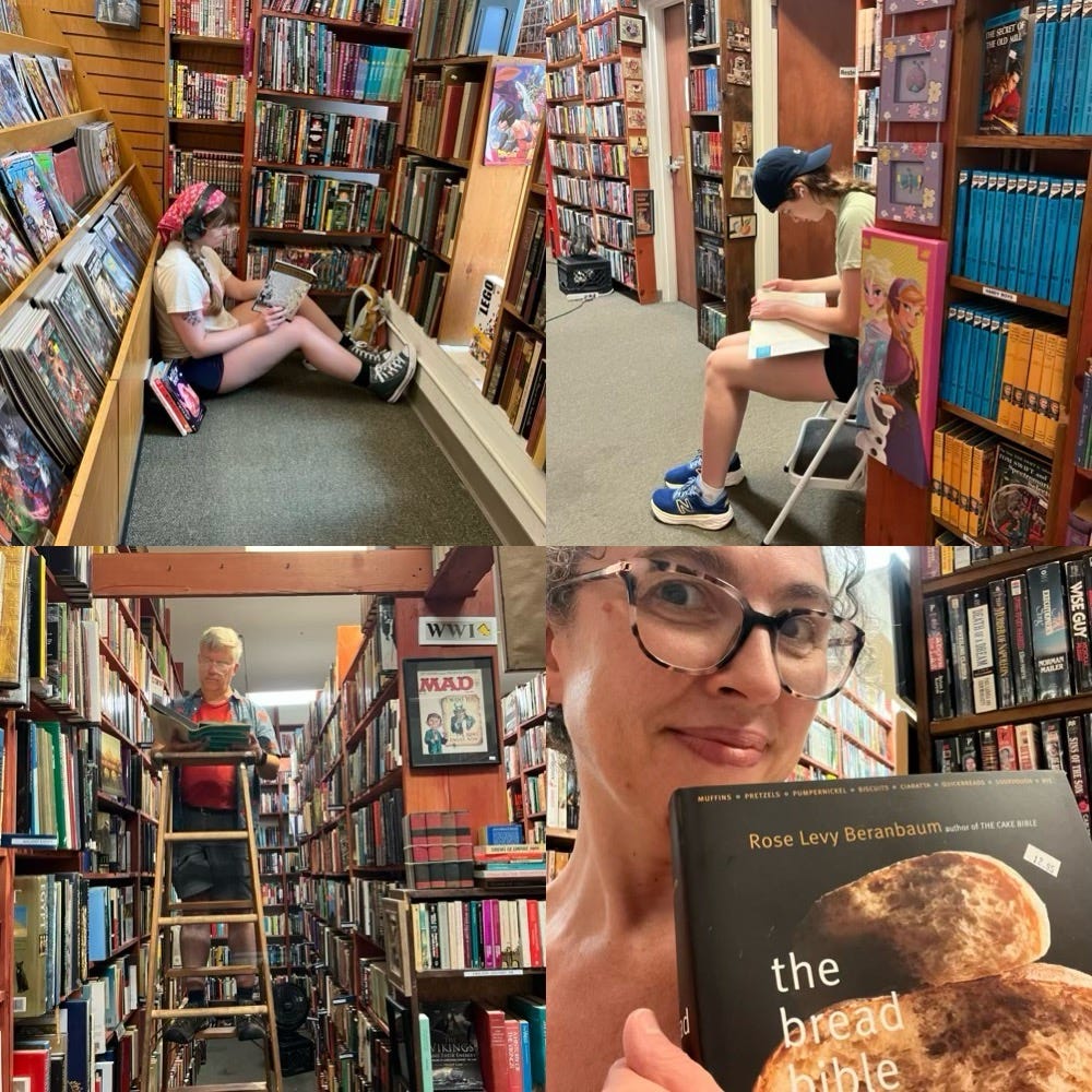 I noticed a curious relief in myself, a sense of rest and peace. Everyone was content, including me. We were safe, we were together, and we were separate. We were in no rush. We were air-conditioned and hydrated. I took a deep breath and made a beeline for the cookbook aisle, emerging later with a pristine copy of Rose Levy Beranbaum’s The Bread Bible. All told, we spent two blissful hours wandering the aisles and finally left with a stack of a dozen books tucked into Jon’s sturdy bike basket.